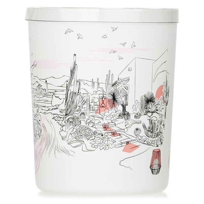 - Container & Aesthetic: White glass container adorned with sketches representing a living desert with sunny valleys.